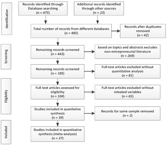 In order to identify the sample of published and unpublished articles discussing the main relationship between environmental values and sustainable entrepreneurial intention, a three-step procedure was followed: Firstly, we reviewed the literature that had been collected from academic databases (Web of Science, JSTOR, SpringerLink, ScienceDirect, EBSCO, Emerald, Wiley Online Library and ResearchGate). We downloaded all relevant references, using combinations of keywords related to sustainable entrepreneurship (e.g., “sustainable start-ups”, “sustainable venture”, “sustainable entrepreneur”), intention (e.g., “intent”, “intention”, “tendency”, “propensity” and “inclination”). Secondly, we searched in the database of SSRN and ProQuest for relevant academic papers and working papers to reduce publication bias. Thirdly, we examined the references of the studies and searched Google Scholar to expand our search range to acquire additional studies. As a result of this procedure, we got 37 articles (an additional conference paper, one additional academic paper and one additional working paper), which led to 40 independent samples with 192,015 observations (removing 2 articles that had the same samples), allowing for 117 effect sizes. A graphical overview of the search process is shown in Figure 1. The studies are discussed in Appendix A.
