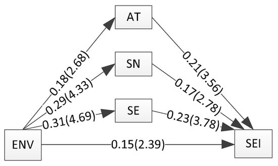Structural equation model. Notes: ENV = environmental values; SEI = sustainable entrepreneurial intention; AT = attitude; SN = social norms; SE = self-efficacy.