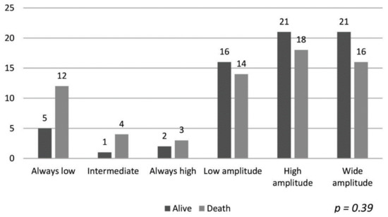 The data of the patients maintaining hemoglobin in the target range and their association with mortality are shown in Figure 1. Despite a longer duration of maintaining target hemoglobin, the association with mortality was not statistically significant (p = 0.12). Similarly, the hemoglobin variability patterns described by Ebben et al. were not associated with overall group mortality [4], as shown in Figure 2 (p = 0.39).