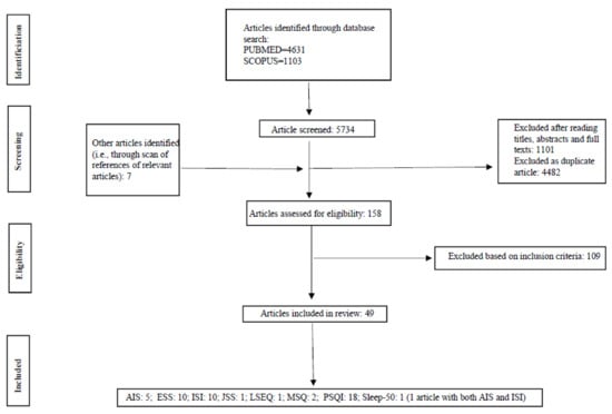 The following descriptors and medical subject reading (MeSH) terms were used as search terms in the databases: “the extended name of the questionnaire” (e.g., Mini-Sleep Questionnaire) OR “acronym form” (e.g., MSQ) AND “reliability” OR “reliable” OR “test-retest” OR “validity” OR “validation” OR “valid”. This procedure was adopted for all questionnaires reported in Table 2 (p. 323) of []. A total of 5734 articles were initially identified (Figure 1). Through the process of article screening, 49 articles, referring to eight questionnaires for the assessment of sleep quality, were included in the final analysis. These articles respected our inclusion criteria: (1) the study population was composed of adults with age > 18 years; (2) the articles were published in English in the temporal range of 2008 to 2020; (3) the study was original research reporting reliability (Cronbach’s alpha and/or test-retest and/or split-half reliability), validity (convergent/divergent correlations and/or known-group differences), and dimensionality of a specific sleep tool (Figure 1). According to the aforementioned three points, the questionnaires included in the present review were: Pittsburgh Sleep Quality Index (PSQI), Athens Insomnia Scale (AIS), Insomnia Severity Index (ISI), Mini-Sleep Questionnaire (MSQ), Jenkins Sleep Scale (JSS), Leeds Sleep Evaluation Questionnaire (LSEQ), SLEEP-50 Questionnaire (SLEEP-50), and Epworth Sleepiness Scale (ESS).