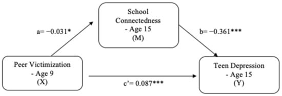 Drawing from the self-determination theory [51], three central psychological needs including competence, relatedness, and autonomy are crucial in determining personal well-being. As applied to school settings, researchers emphasize that well-being can be raised through school connectedness through a process of relatedness and the desire to attach and connect to others in school [52,53]. From this prospective, it is hypothesized that school connectedness mediates, or accounts for the effects of peer victimization on adolescent mental health well-being. Prior research has directly tested the mediational role of school connectedness on adolescent mental health. For example [10], found that the relationship between peer victimization and mental well-being was mediated by school connectedness among Pakistani adolescents with an average age of 16.1 years. Similarly [11], found that exposure to peer victimization was associated with increased depressive symptoms in a sample of majority African American (44.3%) middle school students. In addition, the researchers found that school belonging mediated long-term problems that were related to peer victimization via reductions in depressive symptoms. Ref. [12] examined the relations among peer victimization, school belonging, and mental health with an ethnically diverse sample of transgender adolescents. The researchers showed that school belonging was associated with improved mental health outcomes and mediated the relationship between victimization and mental health issues (e.g., depression, suicidal ideation).