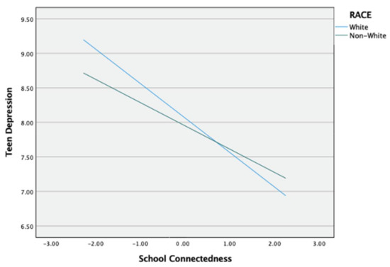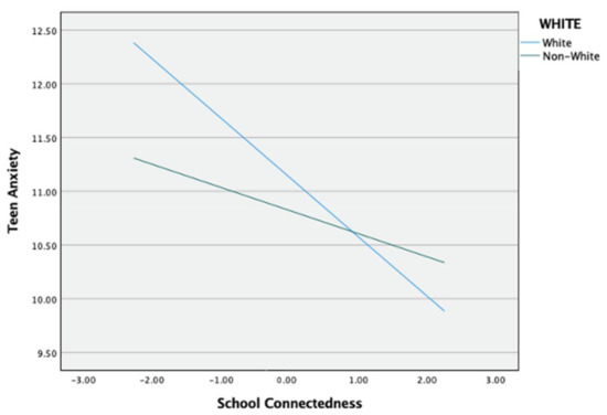 The moderated mediation results for teen anxiety (see Figure 6) showed a significant interaction effect of race on the direct effect of school connectedness and teen anxiety (b = 0.337, p < 0.001). For descriptive purpose, school connectedness was plotted against teen anxiety separately for White and Non-White students (Figure 7). Simple slope tests revealed that both White and Non-White students with high school connectedness had significantly lower teen anxiety. However, this effect was weaker for Non-White students (bsimple = −0.215, p < 0.001) than for White students (bsimple = b = −0.552, p < 0.001). There was not a significant moderating effect of race on the direct effect of peer victimization and school connectedness and peer victimization and teen anxiety (see Table 3). The index of moderated mediation was not significant because its confidence interval included 0 (b = −0.025, 95% CI [−0.068, 0.010]). This indicates that race does not moderate the indirect effect of school connectedness on the relationship between peer victimization and teen anxiety. Given that race moderated just the second-stage moderation model, H5 was partially supported.