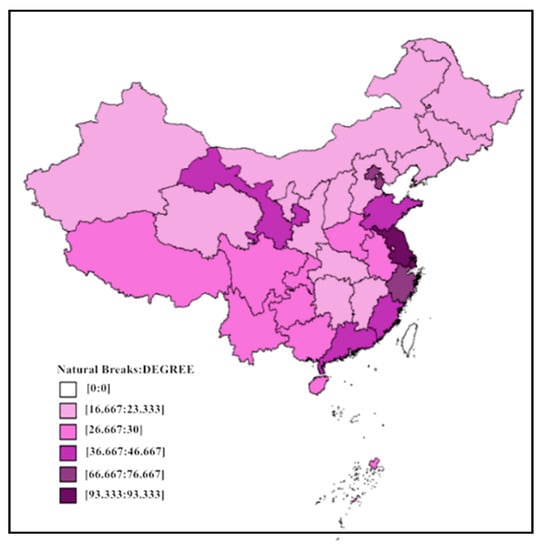 - Degree centrality reflects the central position of a single province in the medical economic spatial network. The higher the degree centrality is, the more connections there are with other provinces, and the more centrally located the province is in the network. The formula is . De is the degree centrality, n represents the number of provinces directly associated with the province, and N represents the maximum number of connected provinces. The degree centrality includes two indicators: out-degree and in-degree. When the out-degree is greater than the in-degree, the node will exhibit a spillover effect; otherwise, it will have a beneficial effect. When the two are equal, there will be equilibrium.
