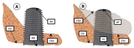 The available bone at the beginning of the study, as well as the evaluation of the newly formed bone at the different follow-up visits, were measured with periapical X-rays obtained with parallelization devices (Rinn XCP rings. Dentsplay Sirona Inc., Delaware, PA, USA). In order to standardize X-ray projections, bite blocks with heavy body silicone (Aquasil Ultra Putty Soft Regular Set, Dentsply Sirona Inc.) covering the devices were prepared for each patient. As the implant length was known and once the measurements were made, a rule of three was used to discard possible magnifications of the image. All measurements were done by the same clinician, who also marked the measurement dots on the X-rays. Measurements were made three times to confirm the lengths. The reference points were: (A) coronal reference point (independent of the bone crest): the most coronal contact between the bone crest and implant (CO) or the implant shoulder itself (HI). (B) apical reference point: at baseline, the most apical contact between the implant and the original sinus floor (CS1) and at the 18-moth follow up, the most apical contact point between the implant and the newly formed cortical sinus (CS2).
