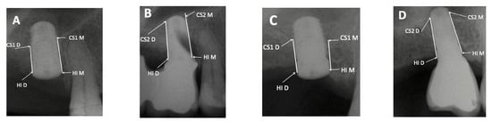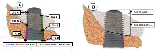 The measurements were made at the mesial, middle and distal sites. To determine the amount of bone gain at the mesial area of the implant apex, firstly the distance from the most mesial area of the implant shoulder (HIM) to the most apical and mesial contact point of the newly formed cortical bone around the implant apex was evaluated after 18 months (HIM–CS2M). This measurement was then deducted from the baseline value which was the distance from the most mesial point of the implant shoulder (HIM) to the most apical and mesial implant contact point with the baseline sinus floor (CS1-M) A calculation was made where the distance HIM–CS1M was subtracted from HIM–CS2M. This positive value would be the spontaneous bone gain obtained in the mesial zone. For distal measurements, the same measurements were made, but at the distal location, which was the result of the subtraction (HID–CS2D) − (HID–CS1D). The same occurred at the medial zone: (HI–CS2) − (HI–CS1). This process is shown in Figure 1 and Figure 2. In cases where spontaneous bone formation occurred beyond the implant apex, the line (HI-CS2) was extended apically until it met CS2, which was sometimes more apical than implant apex (AP) as can be seen on X-ray B in Figure 3.