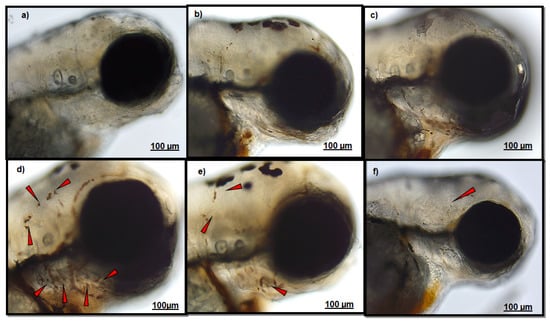 Figure shows representative images of neutrophils localization in the head of: (a) CTRL larvae; (b) polydatin (PD)-T0 larvae; (c) PD-T2 larvae; (d) CuSO4 larvae; (e) PD-CuSO4 – larvae; (f) CuSO4-PD larvae. Red arrows indicate neutrophil localization. Scale bar 100 µM.