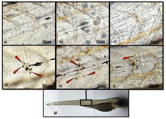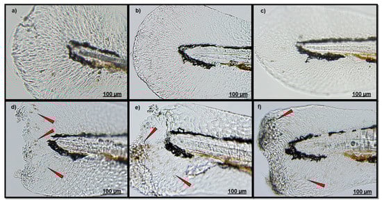 An observation analysis of the CuSO4-exposed group clearly evidenced a massive localization of neutrophils in both fish head and lateral line (Figure 1d and Figure 2d), respect to those groups not exposed to CuSO4 (CTRL (a), PD-T0 (b), and PD-T2 (c)). A lower number of neutrophils were observed in the head of larvae exposed to PD before CuSO4 exposure (Figure 1e), respect to larvae exposed to CuSO4 alone. A similar neutrophil localization was also detected along the lateral line between larvae exposed to CuSO4 alone (Figure 2d) and those exposed to PD before CuSO4 exposure (Figure 2e). Conversely, larvae treated with PD after CuSO4 exposure showed a lower neutrophil migration in both the head and along the lateral line (Figure 1f and Figure 2f).