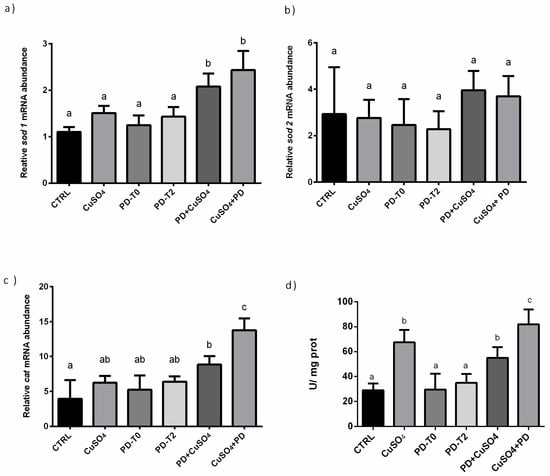 Focusing on sod2 expression, no differences were found among all experimental groups, despite the fact that in PD + CuSO4 and CuSO4 + PD groups an increasing trend was observed (Figure 4b).