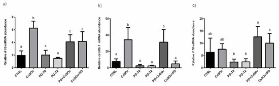 A significant decrease of il10 expression was detected only in PD-T0 and PD-T2 groups. The treatment with CuSO4, alone or administered with PD, did not induce significant changes of mRNA expression (Figure 5c).