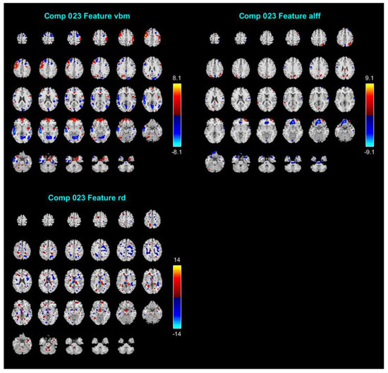 Figure 1 displays IC#23′s spatial maps of GMV (e.g., VBM), ALFF, and RD tensor-based WM tracts. For GMV map, the negative contributing regions (i.e., significantly negative correlations) were mainly in the temporal lobe (superior, middle, and inferior temporal gyrus), and secondly in lingual gyrus, precentral, superior frontal gyrus, middle frontal gyrus, inferior frontal gyrus, medial frontal gyrus, postcentral gyrus, middle occipital gyrus, insula, parahippocampal gyrus and the cuneus. Whereas the positive contributing regions included precentral gyrus, postcentral gyrus, frontal lobe (superior, middle, inferior, and medial), insula, inferior parietal lobule, superior temporal gyrus, precuneus, anterior cingulate, middle occipital gyrus, fusiform and angular gyrus. For the ALFF map, the negative contributing regions are mainly in the medial frontal gyrus, precentral gyrus and superior temporal lobe, and were in the minority in the anterior cingulate, orbital gyrus, superior frontal gyrus, middle frontal gyrus and postcentral gyrus, inferior frontal gyrus, and lingual gyrus. Whereas the positive contributing regions are mainly in the superior frontal gyrus, middle frontal gyrus, precuneus, cuneus, cingulate gyrus, superior temporal gyrus, and superior parietal lobule. For WM tracts map, the negative contributing clusters are mainly in the SLF and IFF.