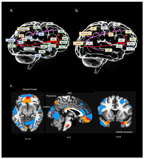 Conceptual illustration to present possible relation between brain regions (structural and functional) and connection paths [white matter (WM) tracts]: (a) interaction between WM tracts and GM region of IC#23; (b) interaction between WM tracts and ALFF regions of IC#23. A colored square with a yellow edge indicates positive clusters in this region. A colored square with a blue edge indicates negative clusters in this region. Colored square with green edge indicates both positive and negative clusters in this region; (c) overlapping (marked in red) between IC #23’s GM (marked in blue) and ALFF regions (marked in yellow); x, y, z = 2, 14, −12. Distinct WM tracts were marked with different colors. PRG: precentral gyrus; POG: postcentral gyrus; MFG: middle frontal gyrus; MeFG: medial frontal gyrus; IFG: inferior frontal gyrus; CC: cingulate cortex; ACC: anterior cingulate; pCC: posterior cingulate cortex; PH: parahippocampal gyrus; STG: superior temporal gyrus; MTG: middle temporal gyrus; ITG: inferior temporal gyrus; IPL: inferior parietal gyrus; LG: lingual gyrus; MOG: middle occipital gyrus; Orb: orbital gyrus; AG: angular gyrus.