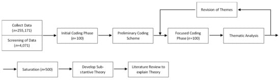 This study follows the Standards for Reporting Qualitative Research (SRQR) guidelines (see Table A1 (Appendix A)). We applied Glaser’s grounded theory approach to develop themes and theories from the dataset using an interpretivist paradigm [20]. Theories behind the panic buying phenomenon were constructed through methodical gathering and analysis of collected tweets by deriving keywords and subthemes, then coding them into relevant sub-themes and themes before developing into theories. This approach could formulate hypotheses based on existing empirical tweets, which could assimilate the data by continually reviewing the sub-themes and themes developed throughout the coding process. New themes apart from existing ones in the literature could be generated. In addition, the interpretivist paradigm stresses the interpretation of information through data collection and methodological analysis, to explain subjective reasons behind phenomenological behaviours [21].