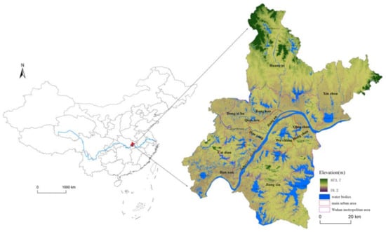 Wuhan (113°41′–115°05′ E, 29°58′–31°22′ N), the capital of Hubei Province, is located in the eastern margin of the Jianghan Plain and the southern foot of Dabie Mountain (Figure 1). The altitude of the study area ranges from 19.2 m to 873.7 m, with most regions being below 50 m. The city center is low and flat, surrounded by low mountains and hills. The plains and hills account for 81.9% and 18.1% of the total area, respectively. It has a subtropical monsoon climate with cold winter and hot summer. The annual average temperature varies between 15.8 °C to 17.5 °C, and the annual average precipitation ranges from 1150 mm to 1450 mm. The annual average wind speed is from 1.56 m/s to 2.73 m/s with the main directions of NNE and NE. In summer, the wind speed is relatively low and stable with the value of 1 m/s from the SW direction []. A crisscross water network was interwoven by different water bodies such as the Yangtze River, the Han River, Liangzi Lake, Tangxun Lake, and East Lake in Wuhan. Wuhan has a population of more than 11 million and a total area of over 8500 km2. It is composed of 13 administrative regions including Jiangan, Jianghan, Qiaokou, Hanyang, Wuchang, Qingshan, Hongshan, Dongxihu, Hannan, Caidian, Jiangxia, Huangpi, and Xinzhou districts.