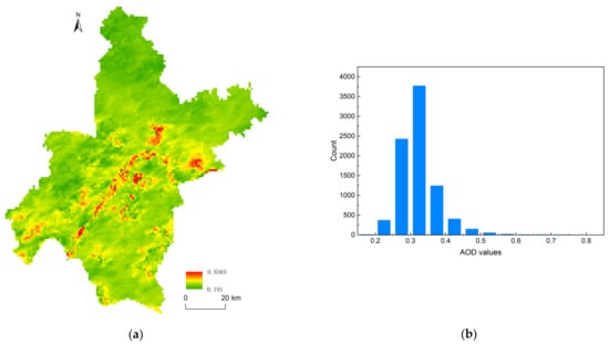 The distribution maps of AOD (Aerosol Optical Depth) values in Wuhan: (a) spatial distribution and (b) histogram distribution.