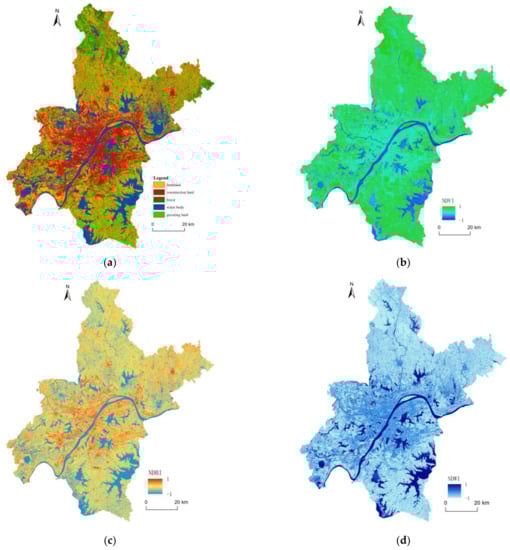 Figure 3b illustrates the spatial distribution map of NDVI values in Wuhan in 2018. Higher NDVI values typically represent larger vegetation amount and greater vegetation coverage. The dark blue areas with negative NDVI values were almost restricted to water bodies. The light blue areas covered by medium NDVI values were detected to well correspond to the construction land both in urban built-up areas and rural developed areas. As expected, higher NDVI values were found in the surrounding suburb areas where plantation or native forests dominate. The NDBI distribution map is illustrated in Figure 3c, which was obtained from Landsat 8 image. It provided continuous variation trends with the increasing gradation in positive values from undeveloped area to slightly developed area to moderately developed area then to highly developed area. The areas covered by negative values expressed good spatial consistency with the distribution of water bodies. Figure 3d drafts the NDWI distribution map with the values ranging from −1 to 1. It expressed continuous variation of water properties at pixel level and provided specific data for the impact analysis of water body on AOD variation.