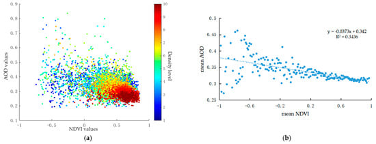 Relationship between AOD (Aerosol Optical Depth) and NDVI (Normalized Difference Vegetation Index) values: (a) scatterplots and (b) regression equation.