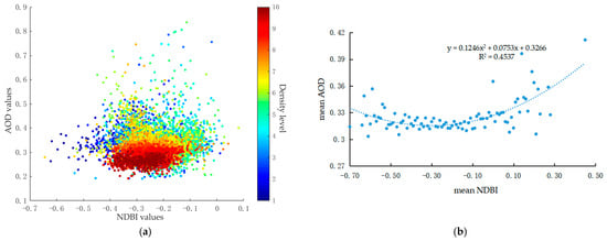 Relationship between AOD (Aerosol Optical Depth) and NDBI (Normalized Difference Build-up Index) values: (a) scatterplots and (b) regression equation.