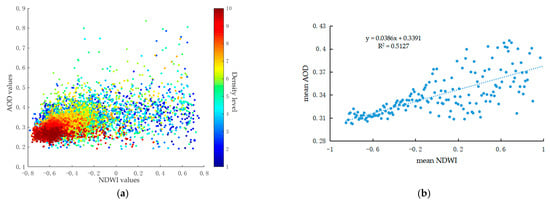 Relationship between AOD (Aerosol Optical Depth) and NDWI (Normalized Difference Water Index) values: (a) scatterplots and (b) regression equation.