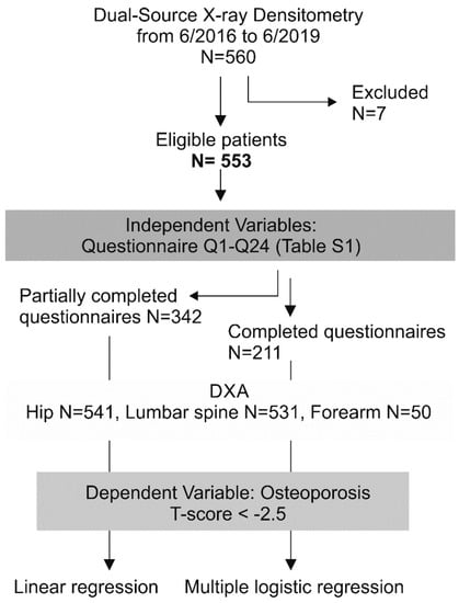 We conducted a retrospective survey study with purposive sampling of all patients investigated in our center between 6/2016 and 6/2019. The study design was based on established standards for survey data collection, analysis, and reporting [,]. Participant flow is graphically illustrated in Figure 1. All patients filled in a survey with morphometric and risk-factor information (Table S1) along with the written consent as a prerequisite for the DXA examination without a physician’s consultancy. From a patient registry of n = 560 surveys, n = 7 subjects were rejected due to insufficient identification information. No gender, age, or risk factor bias could be claimed for the excluded questionnaires. No other exclusion criteria were applied. The eligible database consisted of n = 553 (478 females).