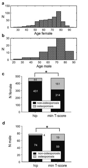 Age distribution and incidence of osteoporosis in the sample. (a) Age distribution histogram of the female subjects, (mean ± standard deviation) 67.68 ± 12.10 y.o. (years old); (b) age distribution of the male subjects, 68.44 ± 13.37 y.o.; (c) incidence of osteoporosis (OP) in female subjects was 9.3% using as a criterion the total hip T-score and 33.89% using the minimum T-score, according to the World Health Organization recommendation; (d) the incidence of OP in the males was 5.1% using as a criterion the total hip T-score and 24.6% using the minimum T-score. The interobserver agreement between the hip and minimum T-score for both sexes was 76.13%, Cohen’s kappa 0.33, p < 0.001 McNemar’s test. Significant statistical difference at p < 0.05 is denoted with an asterisk.
