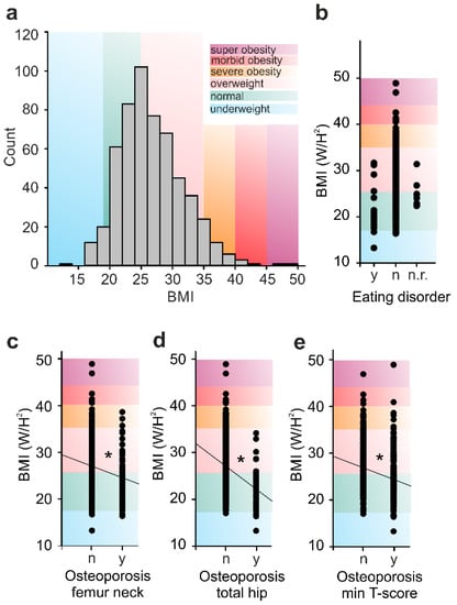 Correlation of the body mass index (BMI) with osteoporosis (OP). (a) Histogram of the BMI showing a right-skewed distribution, with more than 50% of the sample being overweight to morbidly obese. (b) A scatterplot showing how the BMI correlates with eating disorders (ED), yes = y, no = n, n.r. = no response. The BMI of patients with an ED was lower than that of patients without ED, however, all were not necessarily underweight, p < 0.05 Spearman’s correlation. (c–e) BMI correlation with the OP in (c) the femur neck rs −0.177, (d) total hip rs −0.273, and (e) based on the minimum T-score rs −0.197. Regardless of the measuring site, patients with OP had a lower BMI than that of non-OP patients, p < 0.001 Spearman’s correlation. The correlation coefficient of Spearman (rs) is indicated by a solid diagonal line. Statistically significance at p < 0.05 is denoted with an asterisk.