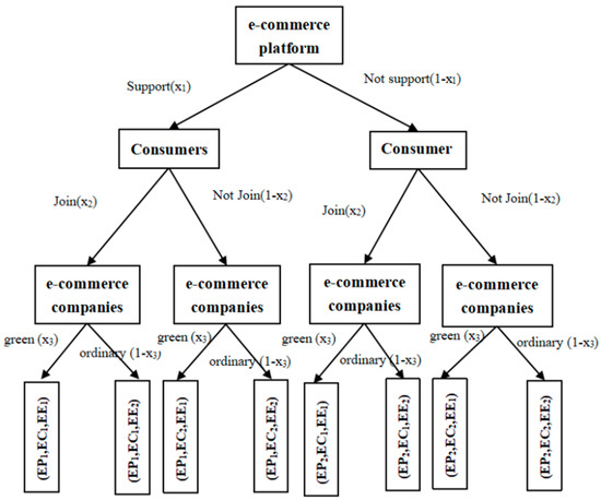 As we know, the recycling of express packages involves many actors, such as consumers, e-commerce enterprises, and e-commerce platforms. The triparty evolutionary game model can better handle situations with more participants. There are studies [2,3,4,5] that have used the triparty evolutionary game model to study both strategy selection and evolution in a multiplayer situation. Zhe Wang et al. studied the recycling of e-waste with the participation of multiple entities [4]. Haiyan Shan and Junliang Yang used a triparty evolutionary game model to study the strategic choice and evolution of enterprises, poor households, and governments when studying photovoltaic poverty reduction [6]. At the same time, the model in this article can better discover the incentive effect of government subsidies on different subjects.