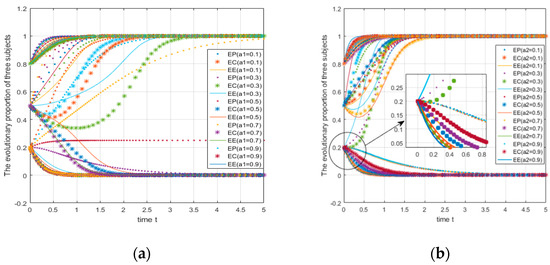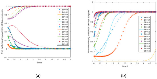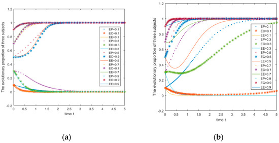 Take the parameters as ; the initial probabilities are 0.2, 0.5, and 0.8. In this situation, the numerical simulation image is shown in Figure 9a. It can be seen from Figure 9a that as the share of government subsidies to e-commerce platforms gradually increases, when the initial probability of the three entities choosing “green strategies” is relatively low (0.2, 0.5), the incentive effect on e-commerce platforms is more obvious. When the initial probability increases to a higher level, the subsidy loses its incentive effect.