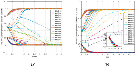 At this time, the e-commerce platform’s fixed subsidy coefficient and the consumer subsidy coefficient is 0.3, and the e-commerce enterprise subsidy coefficient is 0.4. When the total amount of subsidies changes from 1 to 5, the initial probability is fixed at 0.5 (see Figure 10a). For e-commerce platforms, as the total amount of subsidies increases, the strategy converges from the beginning at 0 (S = 1,2,3) to 1 (S = 4,5), In other words, the threshold value of the transition is between 3–4, and there are similar conclusions for e-commerce companies and consumers. The critical value of strategic change is higher (between 4–5) for e-commerce platforms and consumers. In summary, it can be found that the evolution of the three strategies is closely related to the total subsidy amount, and consumers and e-commerce companies need higher subsidy amounts to achieve ideal state evolution.