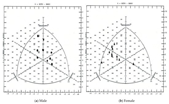 Figure 1 shows a somatochart of the male and female water skiers. The male participants primarily represent as mesomorph-ectomorphs, mesomorphs, and endomorph-mesomorphs, with one participant exhibiting traits of an endomorph-mesomorph. However, revealed with the exception of one female who exhibited ectomorph traits, females primarily represent endomorph component, with mesomorph-endomorphs and endomorph-mesomorphs, comprising the rest of the somatochart.
