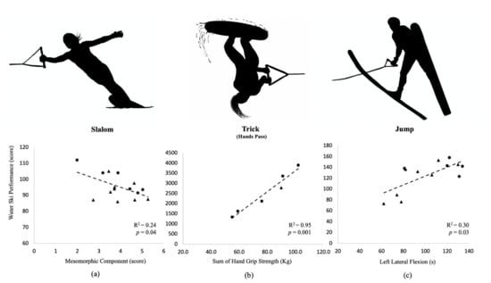 A regression analysis between selected factors and water ski performance in slalom, trick, and jump. Note: Circle represents a male water skier; triangle represents a female water skier. (a) a result of regression analysis between slalom performance score and mesomorphic component; (b) a result of regression analysis between trick hand pass performance score and sum of hand grip strength; (c) a result of regression analysis between jump performance score and left lateral flexion.