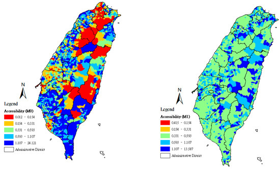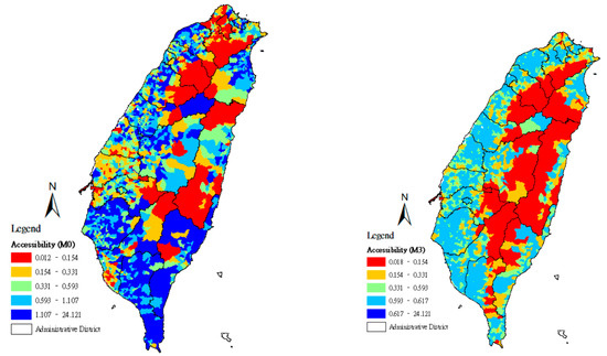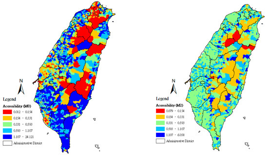 Figure 1 displays the map results for methods M0 and M1, where the lower-accessibility areas are scattered across eastern Taiwan and the mountainous zones of central Taiwan. The calculation of method M0 evaluates how the populations at demand in each county/city of Taiwan reach community care stations along the shortest routes, especially when the service points are distributed across metropolitan areas and districts with convenient transportation. In this case, the service point accessibility score of the population at demand in that county/city is higher. Figure 1 also shows that in the assessment by method M0, the inequality in resource allocation between counties/cities is considerably high. Lower-accessibility areas are mainly scattered across the two northern municipalities (Taipei City and New Taipei City). In method M1, for each service point j, the maximum value for distance is adopted as an approximate representation of the distances between j and the locations at demand i, which rely on its services, allowing the maximum value of resource optimization capacity to be derived. Here, Figure 1 exhibits the map result for method M1. That is, lower-accessibility areas disappear, and the most widely distributed areas are the moderate-accessibility areas, with high-accessibility areas only appearing in certain areas. Although the red and yellow areas determined by method M1 are significantly smaller than those of method M0, the three inequality indicators remain relatively large (Table 5).