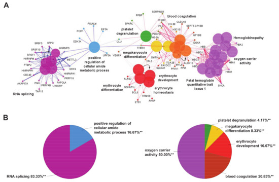 Gene ontology enrichment analysis was performed by ClueGO and mapped for biological processes and human diseases through the integrated databases GO Biological process and CLINVAR (to evaluate the correlation of MKD with other pathologies) for the two separate clusters of downregulated and upregulated genes in MKD. In order to focus our attention only on the most significant processes, we set a very stringent p-value (<0.001) in our analysis. We found highly significant overrepresentation of a number of enriched biological functions both for downregulated genes (Figure 1A, blue edges), mostly related to RNA splicing (Figure 1B, pie chart on the left) and upregulated ones (Figure 1B, red edges), which include oxygen carrier activity, blood coagulation, and erythrocyte development (Figure 1B, pie chart on the right). The diseases annotations highlighted the correlation of MKD with several forms of anemia, like hemoglobinopathies and fetal hemoglobin quantitative trait locus 1 (Figure 1A).
