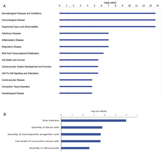 IPA ingenuity pathway analysis was used to predict biological functional processes associated to differentially expressed genes in MKD. Diseases and disorders predicted to be influenced by differentially expressed genes are consistent with MKD characteristics. Top-scoring diseases based on the p-value are indeed dermatological diseases and conditions (p-value 9.40 × 10−3– 1.98 × 10−14, 35 genes assigned), immunological diseases (p-value 1.29 × 10−2– 1.98 × 10−14, 82 genes), organismal injury and abnormalities (p-value 1.41 × 10−2– 1.98 × 10−14, 181 genes), infectious diseases (p-value 9.40 × 10−3– 9.83 × 10−8, 71 genes), and inflammatory diseases (p-value 1.22 × 10−2 –9.83 × 10−8, 73 genes) (Figure 2A). Predicted decreased functions with both significant p-value and z-score are viral infection (p-value 1.05 × 10−6, 70 genes), quantity of blood cells (p-value 1.62 × 10−4, 43 genes), quantity of hematopoietic progenitor cells (p-value 2.22 × 10−4, 23 genes), cell death of connective tissue cells (p-value 2.34 × 10−4, 28 genes), quantity of lymphatic system cells (p-value, 1.89 × 10-3, 31 genes), and quantity of reticulocytes (p-value 2.58 × 10−3, 5 genes) (Figure 2B).
