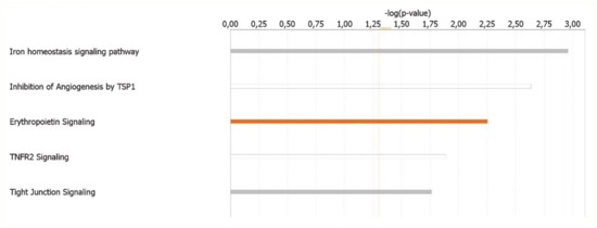 The canonical pathways analysis led to the recognition of the key signaling pathways in which the differentially expressed genes could be involved. A total of 24 pathways significantly associated to MKD (p < 0.05) have been identified. Significance values have been calculated based on the Fisher’s right tailed exact test. The iron homeostasis signaling pathway (p-value 1.10 × 10−3), the inhibition of angiogenesis by thrombospondin 1 (TSP1) (p-value 2.32 × 10−3), erythropoietin signaling (p-value 5.59 × 10−3), Tumor necrosis factor receptor 2 (TNFR2) signaling (p-value 1.29 × 10−2), and tight junction signaling (p-value 1.72 × 10−2) are the five major pathways identified by IPA analysis (Figure 3).
