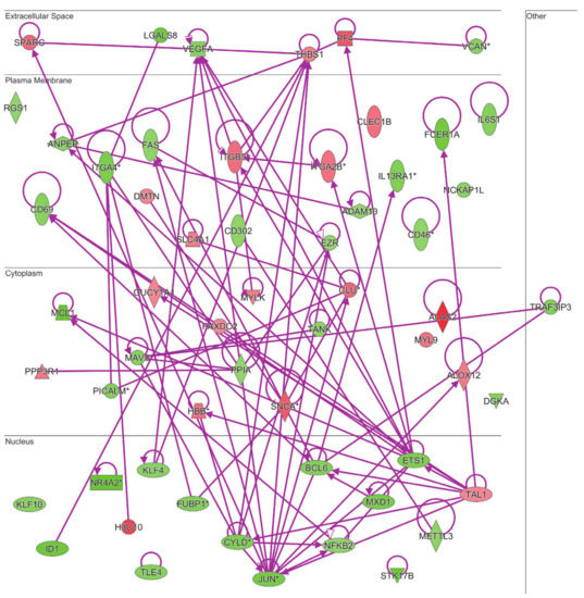 Connectivity of differentially expressed genes in the context of an anemia network. Upregulated genes are depicted by geometric symbols in red, downregulated ones are green. The color intensity is directly related to the fold change value. Continuous lines refer to the genes that are directly interconnected. The * indicates genes identified by more than one probe in the microarray.