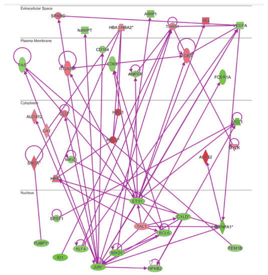 Both the gene ontology and ingenuity pathway analyses above reported highlighted hematological system and hematopoiesis as linked biological functions and pathways in which differentially expressed genes in MKD could be involved. Since anemia is a common clinical feature in MKD patients, never analyzed at the molecular level in the context of MKD, we sought to examine the direct and indirect relationships among our dataset of genes in the context of anemia by IPA. The resulting network identifies 60 differentially expressed genes associated to anemia in MKD patients, among which 40 downregulated and 20 upregulated (Figure 4).