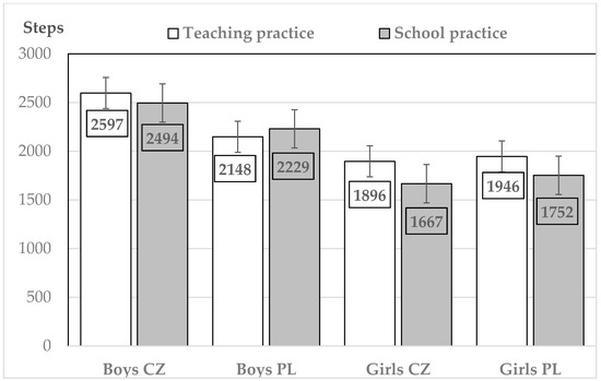 In comparison with their Polish counterparts, Czech boys reported more steps per PE lesson in teaching practice (p < 0.001) as well as in school practice (p = 0.007). As far as girls were concerned, no statistically significant differences were observed between girls from the two countries in teaching practice or school practice.