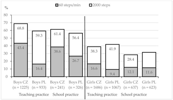 The recommendation of 2000 steps per PE lesson was achieved in teaching practice and school practice in 56.4–68.8% of the Czech and Polish boys, but only in 28.4–41.9% of girls (Figure 2). In total, the recommendation was achieved by 63.4% of the boys and 36.6% of the girls (χ2 = 465.96, p < 0.001, r = 0.263). The achievement of the 60 steps/min threshold was very low in both teaching practice and school practice. The recommendation was achieved in teaching practice and school practice in 16.4–43.4% of the Czech and Polish boys, but only in 9.4–16.6% of girls. In total, the recommendation of 60 steps/min was achieved by 31.7% of the boys and 13.2% of the girls (χ2 = 340.75, p < 0.001, r = 0.225). The highest achievement was observed in school practice among Czech boys (43.4%), while the lowest was observed in teaching practice among Polish girls (9.4%).