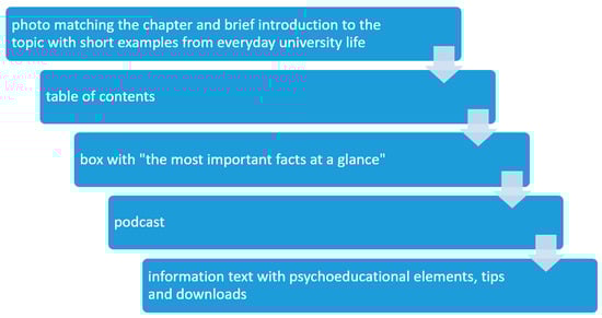 In the next step, the contents and the website were developed. The chapters were then gradually published on the website, evaluated, and revised. At the end of the development process, the online portal consisted of eight chapters. Each chapter is dedicated to one topic (see Table 1 for further information). Considering academic themes being the most often reported stressors for college students, three of our chapters aimed directly at reducing stress in this area in order to promote the students’ mental well-being: (a) the chapter “mastering exam stress” provides psychoeducative information and skills to improve exam preparation and learning strategies; (b) the chapter “well organized” contains information on implementing time schedules throughout the semester and how to balance studies with other important parts of life; (c) the chapter “defeating procrastination” provides strategies on how to stay motivated during studies.