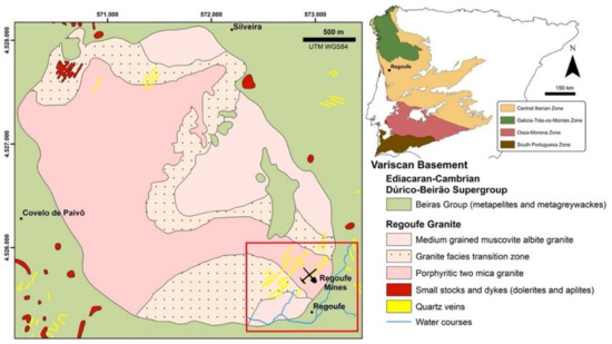 The W-Sn ore deposit of Regoufe is installed in the southeast (SE) rim of a subcircular granite massif with the same name, which occupies an area of about 6 km2 (Figure 1). Generically, the Regoufe granite is described as a muscovite-albite porphyritic granite [20,21], with a whole-rock Rb-Sr age of 280 ± 8 Ma [22]. Although muscovite is a major constituent of the granite, it changes the composition from a medium-grained muscovite-albite granite (in the northern and eastern parts of the batholith) to a tourmaline-bearing porphyritic two-mica granite (particularly in the western sector) through a non-uniform mineralogical transition zone [23]. This granitic intrusion induced a medium- to low-grade contact metamorphism aureole in the country metasedimentary rocks of the Dúrico–Beirão Supergroup (mainly composed by phyllites and metagreywackes), which is materialised by the occurrence of biotite and phyllitic material in the low-grade regional metamorphic rocks [21]. The final stages of the granitic intrusion were characterised by hydrothermal processes that led to the precipitation of W-Sn ores in the quartz veins [21,24] and also caused hydrothermal alteration in both granite [21,24] and metasedimentary rocks [25].