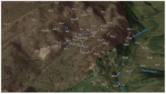 A total of 61 topsoil (R1–R61) and 10 surface water (A1–A10) samples were collected from Regoufe mine precincts and surroundings (Figure 2). The soils comprised samples developed on both granite (51 samples) and metasedimentary (10 samples) bedrocks. The sampling procedure entailed the collection of ca. 2 kg of superficial debris-free soil samples (~10–20 cm depth), which were stored in individual polyethylene bags. The surface water samples were collected from the two main streams of the area (Regoufe and Pousadela streams) and from mine drainages during two sampling campaigns (wet/winter and dry/summer seasons). In the summer campaign (dry season), only three sites were sampled; thus, surface water samples A8, A9 and A10 were collected at the same locations as A1, A6 and A7, respectively. The site selection was governed by the representativeness and typology of those sampled in the first (wet season) campaign, as well as water availability. The water samples were stored in acid-washed 1 L Teflon bottles and kept refrigerated in a cooler box with ice during the transport to the laboratory.