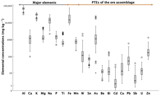 Descriptive statistics of the compositional spectrums of ore assemblage PTEs found in soil samples are presented in Table 1. In addition, for better visual inspection, the concentration ranges of both the PTEs and the major elements are illustrated in Figure 3 (box plots). As expected, in general, the concentrations of major elements were greater than PTEs and had a smaller range of variation. Calcium, Na and Fe were those with a greater concentration range, probably because of multi-sources and/or due to the greater susceptibility to weathering of their hosting minerals. Oppositely, with the exception of Sn, the PTEs showed large content intervals and a greater number of maximum anomalous values, indicating uneven and punctual dispersion. Among these elements, arsenic stands out for its remarkably high amounts and high toxicity [41].
