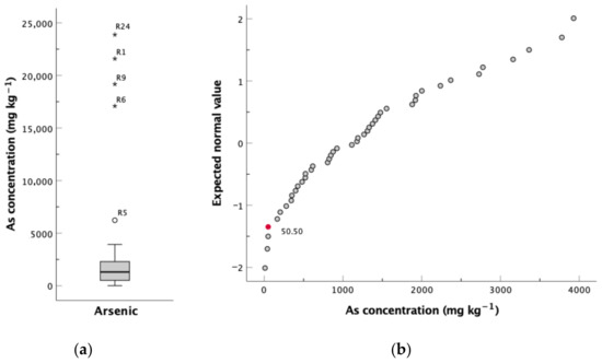 The GBm values were obtained from Fonseca [38], concerning the study of another W-Sn mine (Rio de Frades mine) in the vicinity, where the mineralised veins are installed in the same metasedimentary units that crop out in the Regoufe area. The GBgr values were determined according to Zhou and Xia [42], exclusively taking into account samples collected over granitic bedrock. Essentially, the method consisted of the graphical inspection of the experimental data, with the goal of distinguishing between geogenic concentration values and anthropogenically influenced samples. Accordingly, box plots were elaborated for selected elements to detect anomalous values, represented outside of the whiskers, which were removed from the dataset before the forthcoming step (Figure 4a). Outlier-free normal quantile–quantile plots (Q-Q plots) were inspected to identify breaks and inflection points, which imply the presence of different processes [42]. As illustrated in Figure 4b, the arsenic Q-Q plot undergoes inflection at 50.50 mg kg−1, which was assumed to represent the natural soils’ geochemical background value. In the same reasoning, geochemical background levels were determined for Bi, Cd, Cu, Fe, Mn, Pb, Sb, U, W and Zn (Table 1).