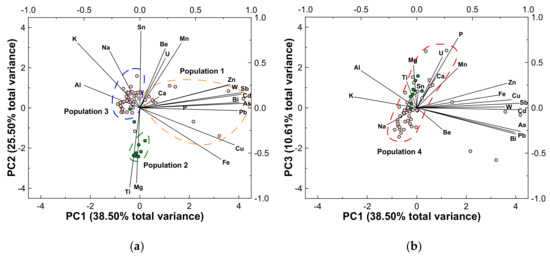 When plotted in the first factorial plan (Figure 5a), three populations are easily discerned: (a) Population 1 is represented by the most enriched samples of the dataset, which were collected in the proximities of the abandoned mine adits; (b) Population 2 corresponds to samples collected on the biotite-rich metasedimentary bedrock; and (c) Population 3 refers to soils sampled on the tailings and granitic basement.