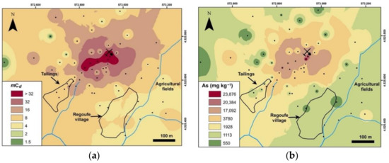 Given the substantial percentage of samples with high levels of contamination, it is important to visualise how this contamination is spatially distributed. In Figure 6a, the projection of mCd data obtained for Regoufe topsoils is presented. In this map, it is possible to observe that the main focus of contamination is located within a subcircular area surrounding the mine adits, extended either upstream or downstream, along a northwest–southeast (NW–SE) direction. Interestingly, the area where the major tailing deposit is located does not show the highest contamination levels. This might be explained by the high amounts of quartz from gangue veins, which cause a dilution effect and probably promote the migration of PTEs to deeper layers, as this process is facilitated by the low adsorption ability of quartz. In addition, the agricultural fields, which are to a certain extent shielded from the influence of the mine adits and facilities by the site’s geomorphological constraints, exhibit moderate and, punctually, high levels of contamination. The high arsenic concentrations found in the agricultural fields may be attributed to (a) inheritances from the past, when the mine was in operation and dispersion was promoted by the grinding, ore transport, etc.; (b) flooding events that enhanced transport and deposition of As-rich particulate and/or solubilised phases from other abandoned mines located upstream of this area; and/or (c) a consequence of the Regoufe natural bedrock enrichment, as verified by the higher geochemical background value of arsenic regarding the Portuguese soils’ background values. This aspect should be taken into special consideration because, as can be observed in Figure 6a,b, arsenic is mainly responsible for the mCd distribution pattern. As has been widely documented, arsenic can enter the food chain, representing a risk factor for human health [49,50].