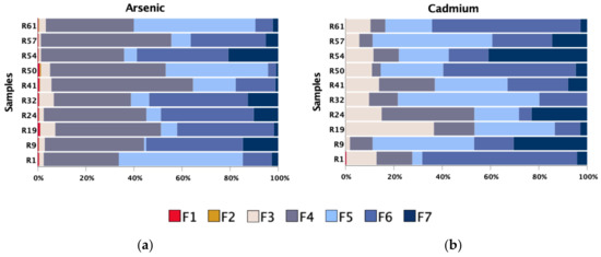 Extraction percentage of (a) As and (b) Cd obtained by sequential selective chemical extraction (SSCE) in selected soil samples: (F1) exchangeable ions (bioavailable fraction), (F2) acid-soluble forms, (F3) Mn-oxides, (F4) amorphous Fe-oxyhydroxides, (F5) organic matter and sulphides (partially), (F6) crystalline Fe-oxides and (F7) resistant minerals (such as silicates and some oxides and sulphides).