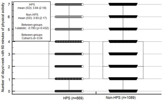 Engaging in at least 60 min of PA a day ranged from zero to seven days/week in both study groups; no between-group differences were observed in the mean number of days/week (HPSs: 3.84 ± 2.19 days/week, 95% confidence interval of the mean = 2.99–3.42; non-HPSs: 3.93 ± 2.17 days/week, 95% confidence interval of the mean = 3.13–3.38; t-statistic = −0.785, p = 0.432). Moreover, the between-group effect size was trivial (Cohen’s d = 0.04) (Figure 1). In both schools, 10% of the children met the recommended PA level; the prevalence of children who did not reach the recommended level was higher than that of children who met the recommended level (HPSs: chi-squared = 424.64, p < 0.001; non-HPSs: chi-squared = 696.64, p < 0.001). The between-group differences in prevalence of children meeting and not meeting the PA recommendations were non-significant (chi-squared = 0.00; p = 1.00). However, in both HPSs and non-HPSs, in comparison to females, males presented higher levels of PA (HPSs PA level—males: 4.24 ± 2.26, females: 3.34 ± 2.04, t-statistic = −4.83, p < 0.00001; non-HPSs PA level—males: 4.51 ± 2.23, females—3.45 ± 2.01, t-statistic = −8.22, p < 0.0001).