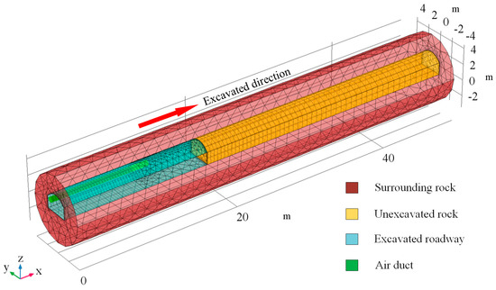 The established geometric model is shown in Figure 1, and it is similar to that of the actual situation, including an excavating roadway equipped with an air duct, unexcavated rock and surrounding rock. The shape of the roadway section adopts the conventional arch roadway with a width of 5 m, a straight wall of 1.5 m, an arch height of 0.75 m. The initial length of the excavated roadway is 18 m, as well as the length of the air duct is 12 m. The auxiliary ventilation duct with a diameter of 0.6 m is arranged on the left side of the roadway, and the duct outlet is 6 m away from the working face. The original temperature of the surrounding rock and air in the roadway is 45 °C, and the advance rate of the working face is 0.2 m/h. The main parameters of the model are set in Table 1, which are substituted from the contemporary literature [42,43].