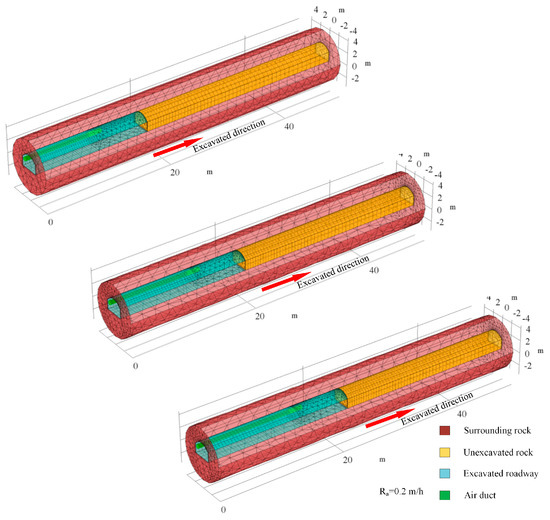 A moving mesh method is incorporated into the mathematical model to perform the dynamic excavation of the roadway. The advance of the working face represents the excavation of the roadway. In the case that the region of roadway and rock are transformed as the advance of working face, the mapped mesh will deform with the movement of the boundary. Avoiding the mesh distortion arisen from the deformation of mapped mesh, the Laplace smoothing method is adopted to modify the deformation of the mesh by global convergence. Figure 2 depicts the grid movement of the physical model. In the process of roadway excavation, the working face of the roadway gradually advances to the unexcavated rock, and the length of the roadway increases correspondingly. The distance between the duct outlet and the working face mains the same. All the governing equations are implemented and numerically solved using the COMSOL Multiphysics software based on the finite element method. Simultaneously, as the temperature of surrounding rock and heat transfer are related to time, the transient solver is selected.