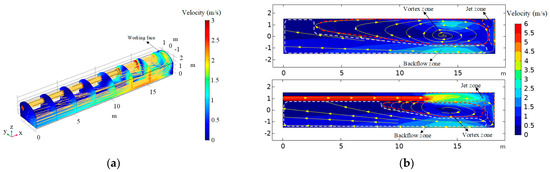 Air flow velocity distribution in the roadway: (a) air velocity isoclines in the Y direction; (b) airflow field in the different Z plane.